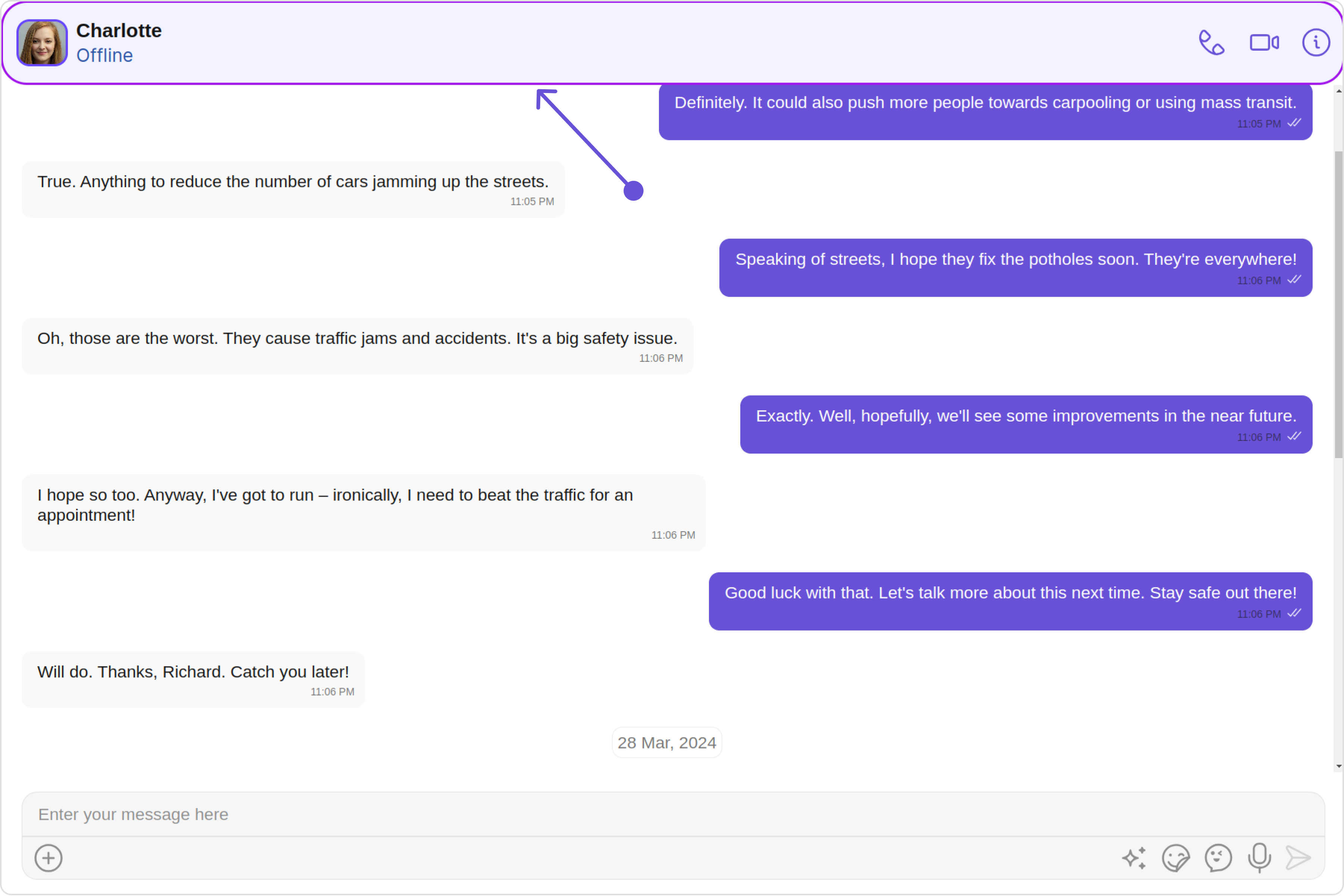 You can set your custom message header view using the messageHeaderView property. But keep in mind, by using this you will override the default message header functionality. Example Default