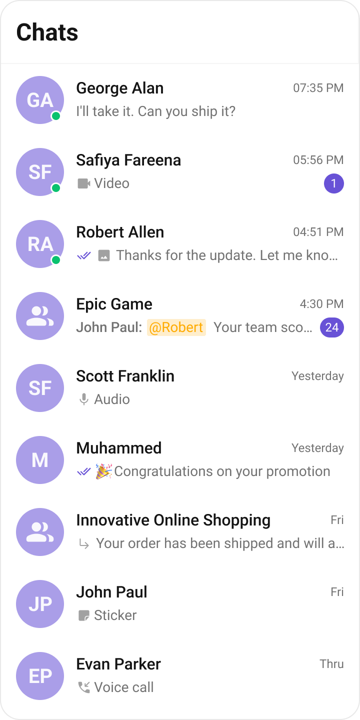 | Title View | Custom widget for the title section of each conversation | titleView: Widget Function(BuildContext, Conversation) |