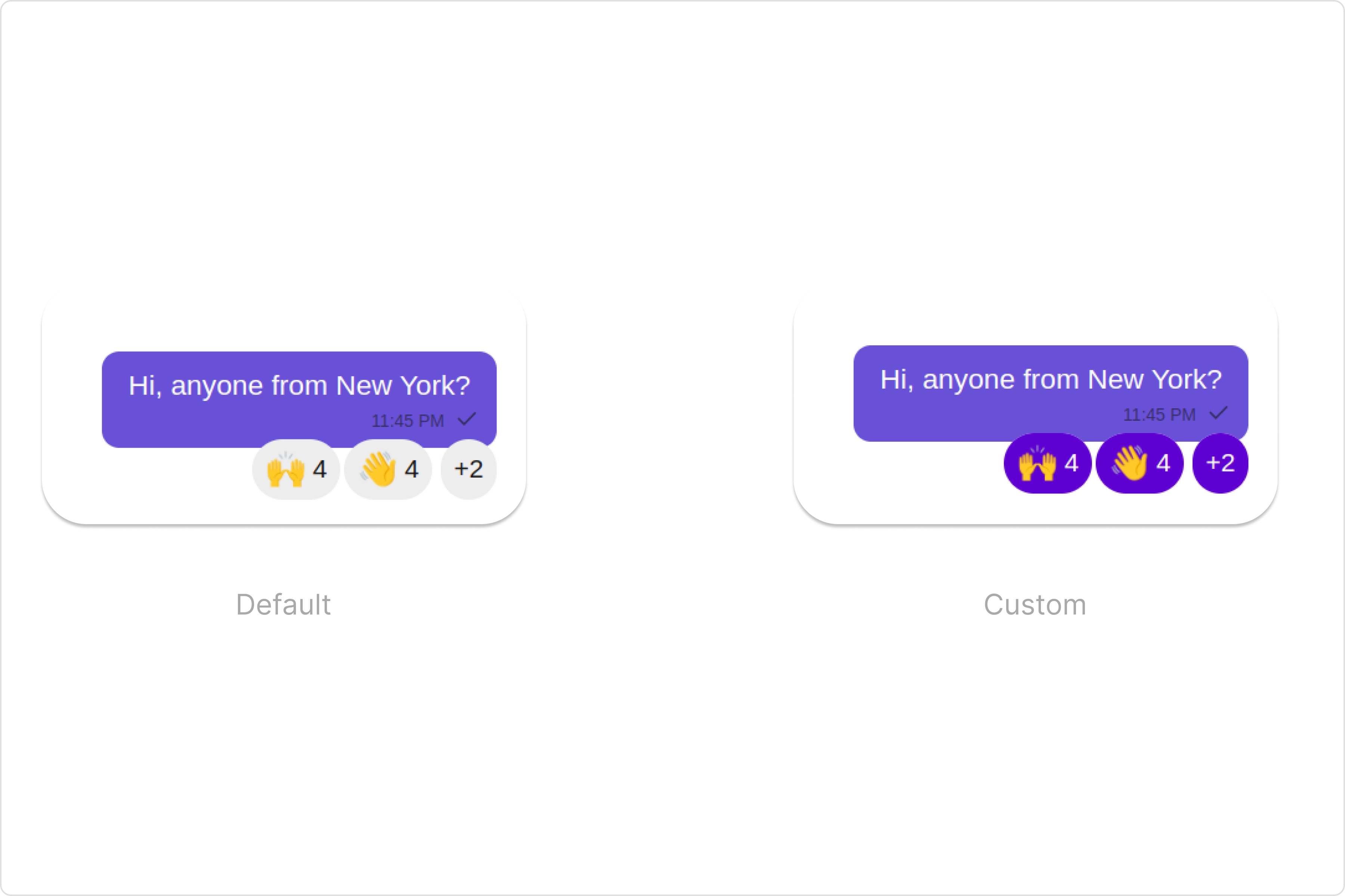 To customize the appearance, you can assign a reactionsStyle object to the Reactions component. Example In this example, we are employing the reactionsStyle.